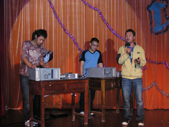 在本次晚会中,装机秀可谓是本次晚会中的最佳看点。由去年的冠军苏毅和亚军徐剑再次比拼,周中蒙担任评委。比赛开始,两人全神贯注,细心组装,灵活操纵着手上的螺蛳刀,“一步一个脚印“各种大小零部件都被两人严谨的组装在机箱内,在时间上也是争分夺秒, 两位旗鼓相当,6分钟左右的时间,他们都已经完成了次此的装机秀。一场游戏竞技秀美仑美奂,两位竞技者为我们展现了游戏的技术与魅力,短短几分钟,就让我们如同看了一场激烈的NBA球赛。展现了IT业的多姿多彩。