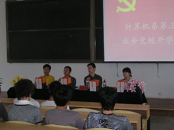 4月9日下午2:40, 我系第三期业余党校开学典礼在我系101教室举行。计算机系党校分校校长、计算机系党总支书记苏跃飞以及计算机系辅导员陶学裕、罗小阳、陈小红出席了本次开学典礼。本次党校培训有党校学员和青年理论社的社员共近100人。