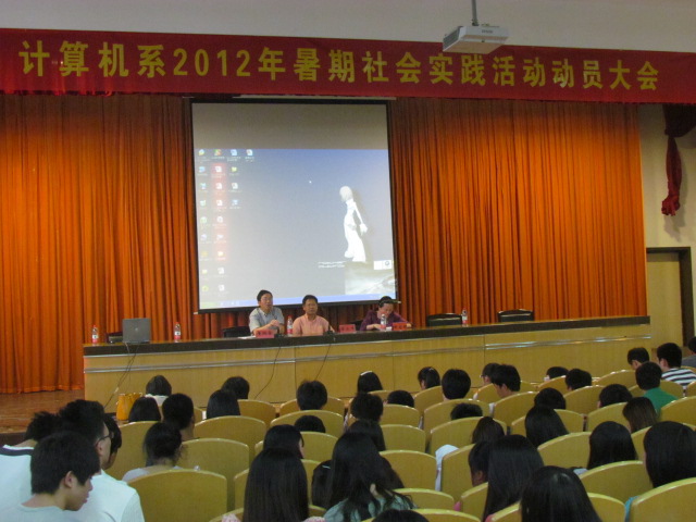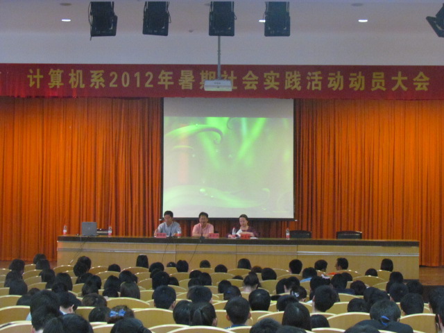 为了激发我系大一大二学生参与暑期社会实践的动力,让我系学生摆正心态面对暑期社会实践,5月22日,我系在信息楼报告厅召开了计算机系2012年暑期社会实践活动动员大会。计算机系党总支书记童炳金、系主任李永平、系副主任田启明以及全体大一大二学生参与了此次大会。大会由童炳金书记主持。