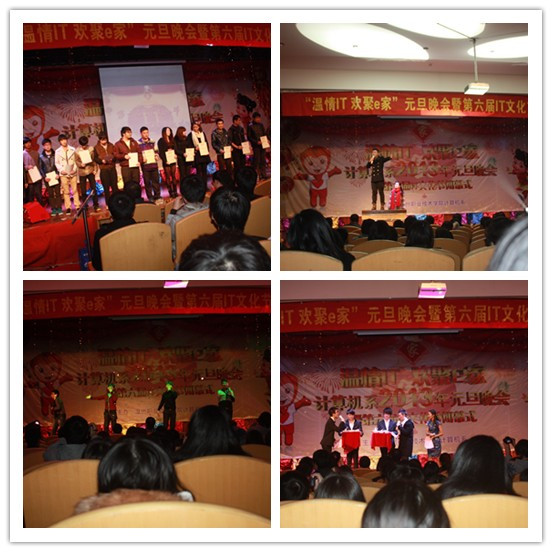 三个主持人用风趣的“上海滩”表演配合团学干部主席团的“江南style”集体舞拉开了晚会的序幕。接着系主任田启明老师发表“IT文化节”闭幕式和晚会致辞。她说:在即将过去的2012年,我系有着可喜的成绩和进步,我系组织学生参加了7个项目的省级、国家级的技能比赛,有34位同学在各类大赛中取得了优异的成绩,其中,获得国家二等奖1项,省一等奖5项,省二等奖3项,省三等奖4项,参与指导老师达20多人次,这充分展示了我系学生的才华和技艺,而此次“IT文化节”7大项学生技能比赛共300多名参赛学生中,也最终决出74名获奖者,其中一等奖16名,二等奖26名,三等奖32名,这一切都离不开广大老师和同学们的辛勤耕耘,计算机系领导班子向指导老师表示衷心的感谢,向获奖同学表示热烈的祝贺!同时,她希望在未来新的一年中希望计算机系能再接再厉,同学们也能更上一层楼!随后晚会对技能比赛中一等奖获者颁发“三早一晚IT技能学生指导师”的聘书,希望他们对同学们技能的培养也能出一份力。