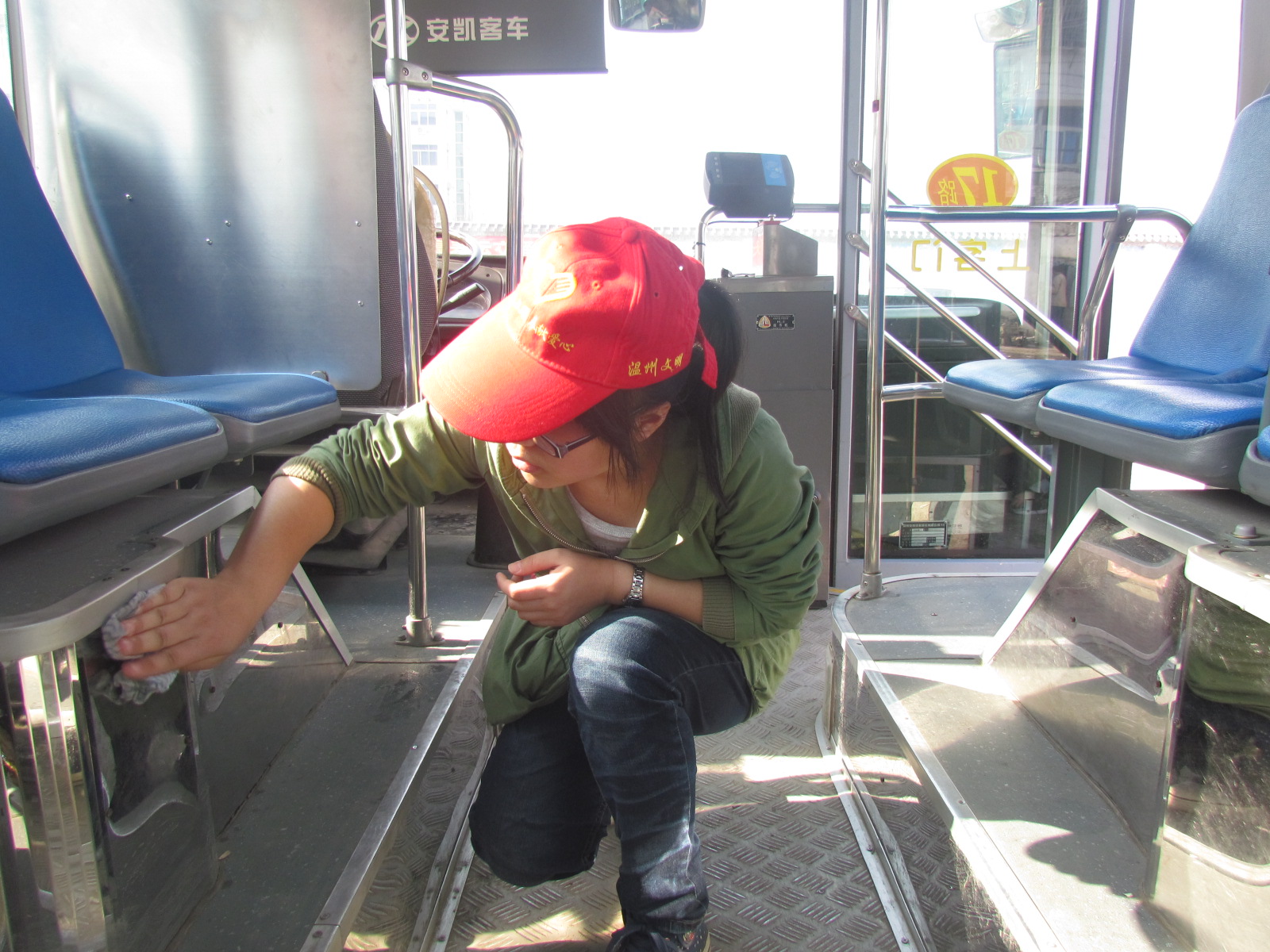 早上8点,20余名自愿者带着抹布和水桶来到35站。等乘客下车完毕后自愿者们有序的进行着分组工作,有的负责车身,有的负责车头,有的负责车尾,还有的负责车厢。每当公交车进站,大家争先恐后上前,干的热火朝天,充分展示了当代大学生的良好风貌,引得站台上候车的乘客和一些行人驻足观看。自愿者们的行动得到了司机和行人的高度的肯定和赞赏。