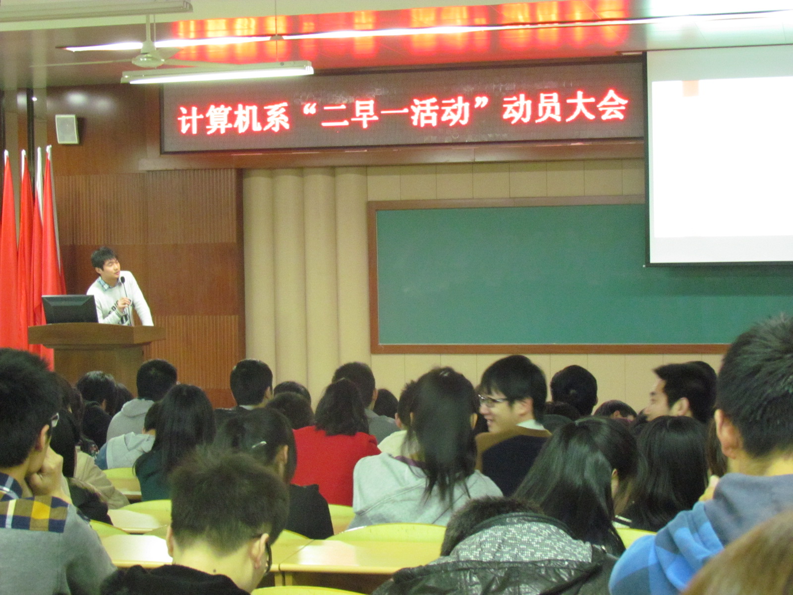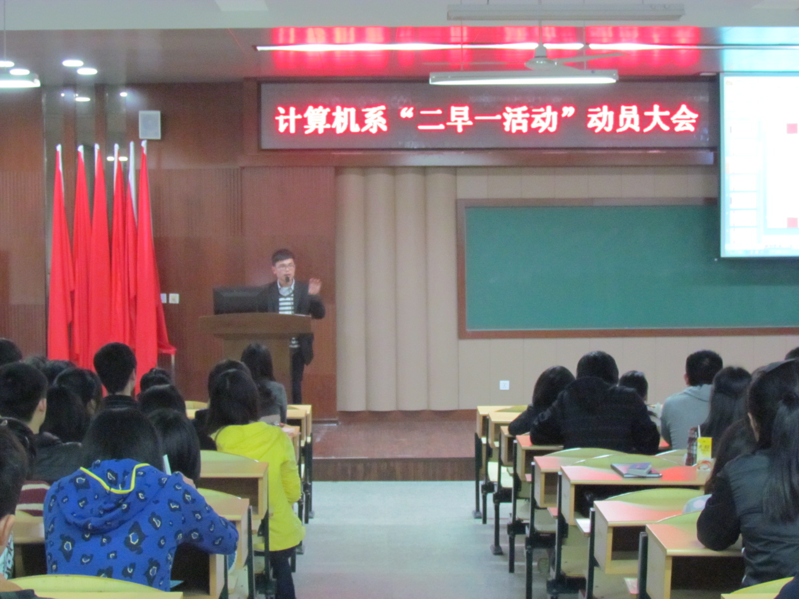 为了让学生更深入的了解“二早一活动”的内涵和设置目的,让学生更全面的了解计算机系“二早一活动”的改革方案,激发学生对“二早一活动”的热情和兴趣,养成其自觉学习、主动学习的良好行为习惯,我系于3月11日教学楼2-101教室召开了计算机系“二早一活动”动员大会。