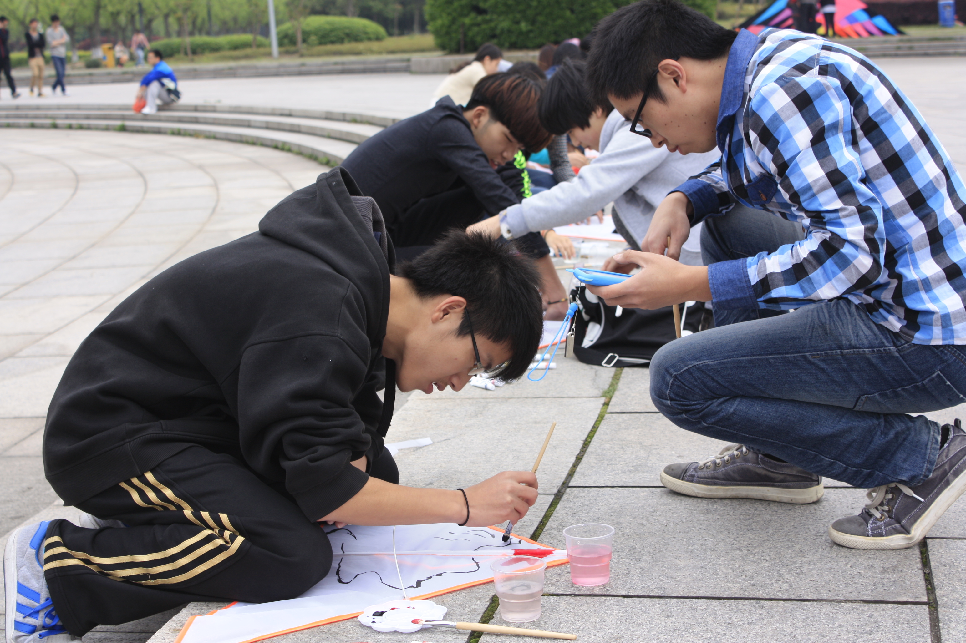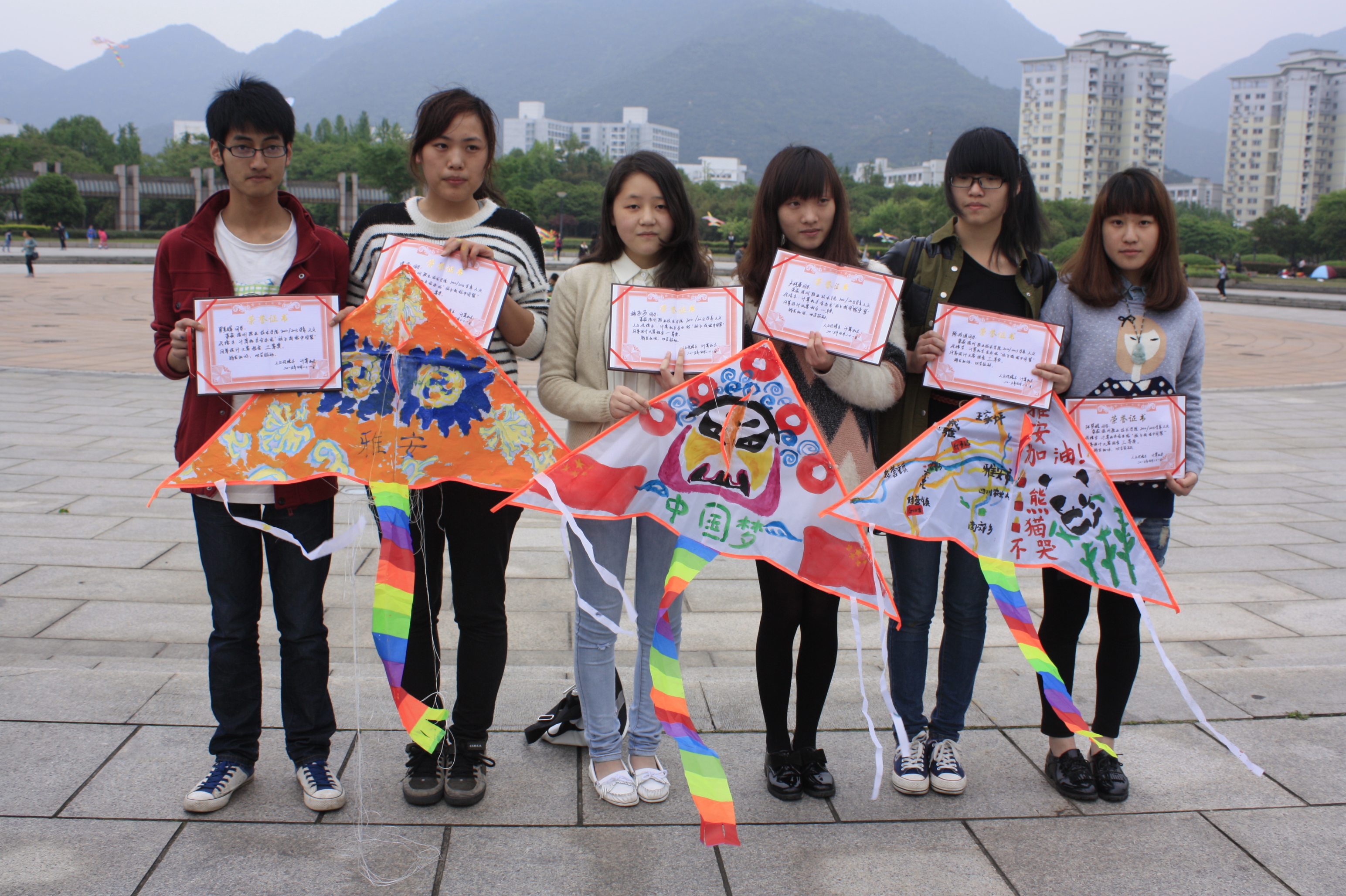 据悉,此次活动分为两大环节。第一个环节:由选手们自由组队,两人一队,40分钟内在主办发所提供的空白三角风筝上设计风筝图案,此环节有90分。第二环节:选手们放飞他们的风筝,此环节有10分。在制作现场,选手们分工合作,有的绑骨架,有的绘画,然后一起放飞。选手们都表现出极大的热情和极高的兴致。热闹的气氛引来了众多的路人,他们驻足观赏,不时指点一二,与选手们共同分享放风筝的轻松和喜悦。天空中样式各异、特色鲜明的风筝,承载着同学们的“中国梦”,成为学子广场上一道特别亮丽的风景。最值得一提的是,在此次活动中许多同学在风筝上写着对四川雅安的祝福,展示了当代大学生关注社会,关怀同胞的良好风貌。
