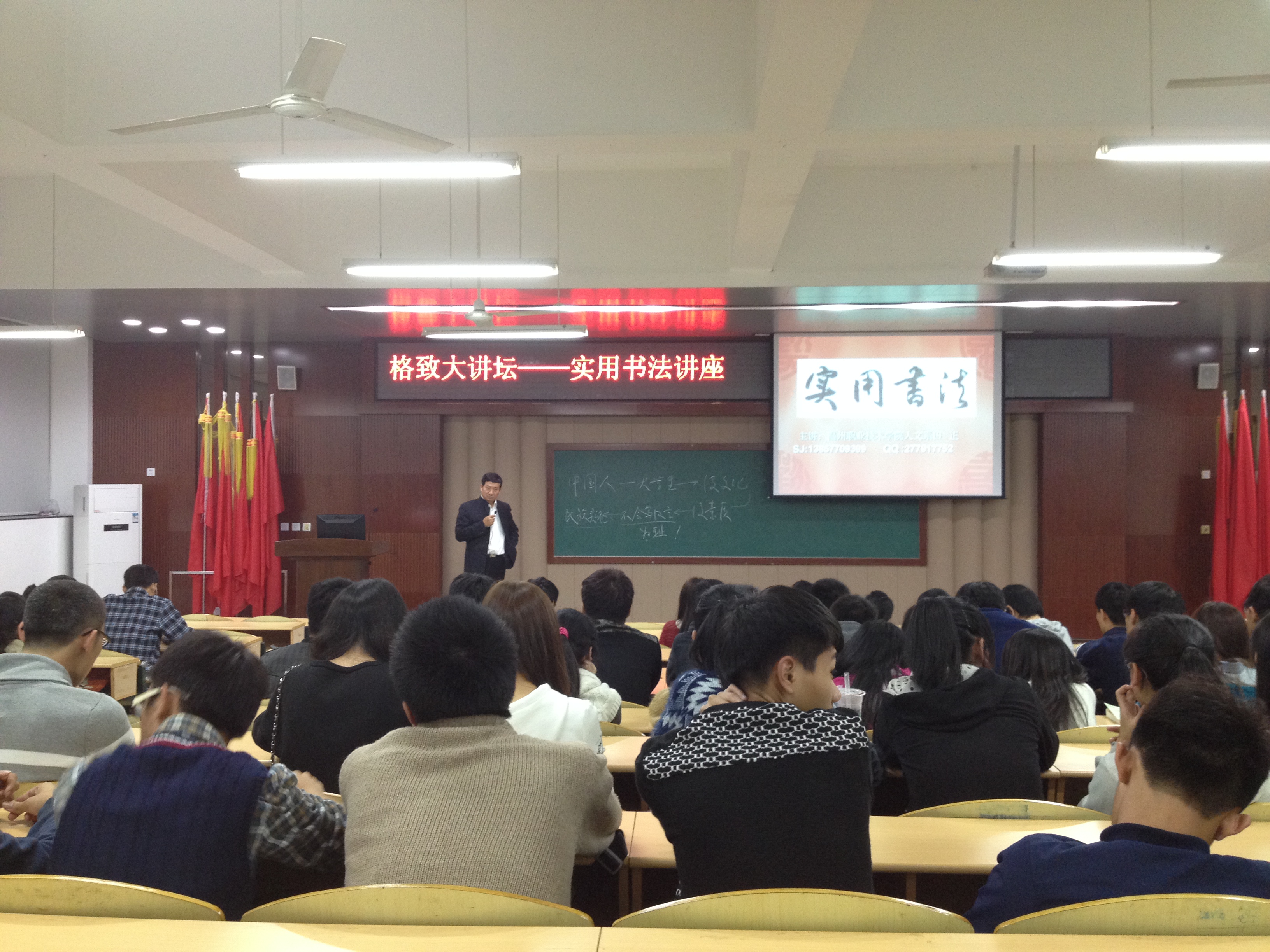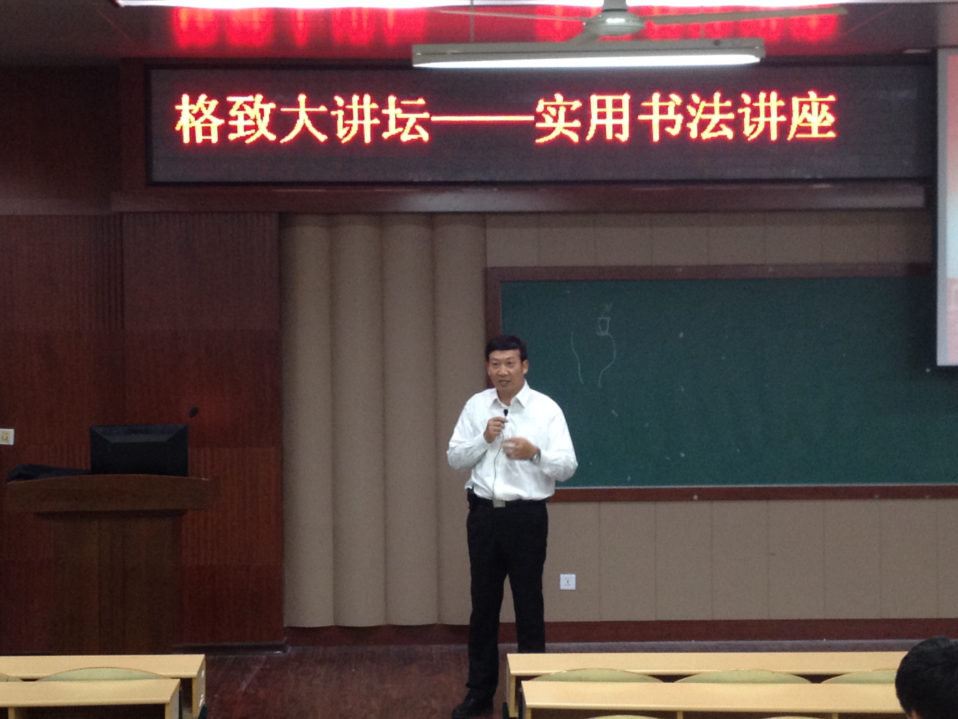 为了让使当代大学生更了解中国文化,真正地铭记汉字书法对于中国人的深刻意蕴,我系“格致大讲坛”于11月11日在好学楼101教室开展。本次讲座主题为“实用书法”,由人文系系主任田正老师主讲。我系全体大一新生聆听了此次讲座。