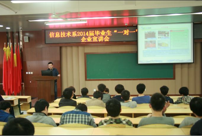 据悉,本次活动共分三个流程:校企合作座谈会、企业“一对一”宣讲会和就业双向选择。在座谈会上,网络技术专业负责人叶展翔老师就往届毕业生/实习生用工评价与反馈、专业顶岗实习与企业人才储备培养和校企合作等三个方面与企业进行了对接;在“一对一”宣讲会前,由学工办罗小阳老师、2011届优秀校友王新刚同学和2013届优秀校友赵汉利同学就职业生涯规划、择业和就业过程中的注意事项与2014届毕业生进行了现场交流,交流会结束后,9家企业分别进行了宣讲活动。