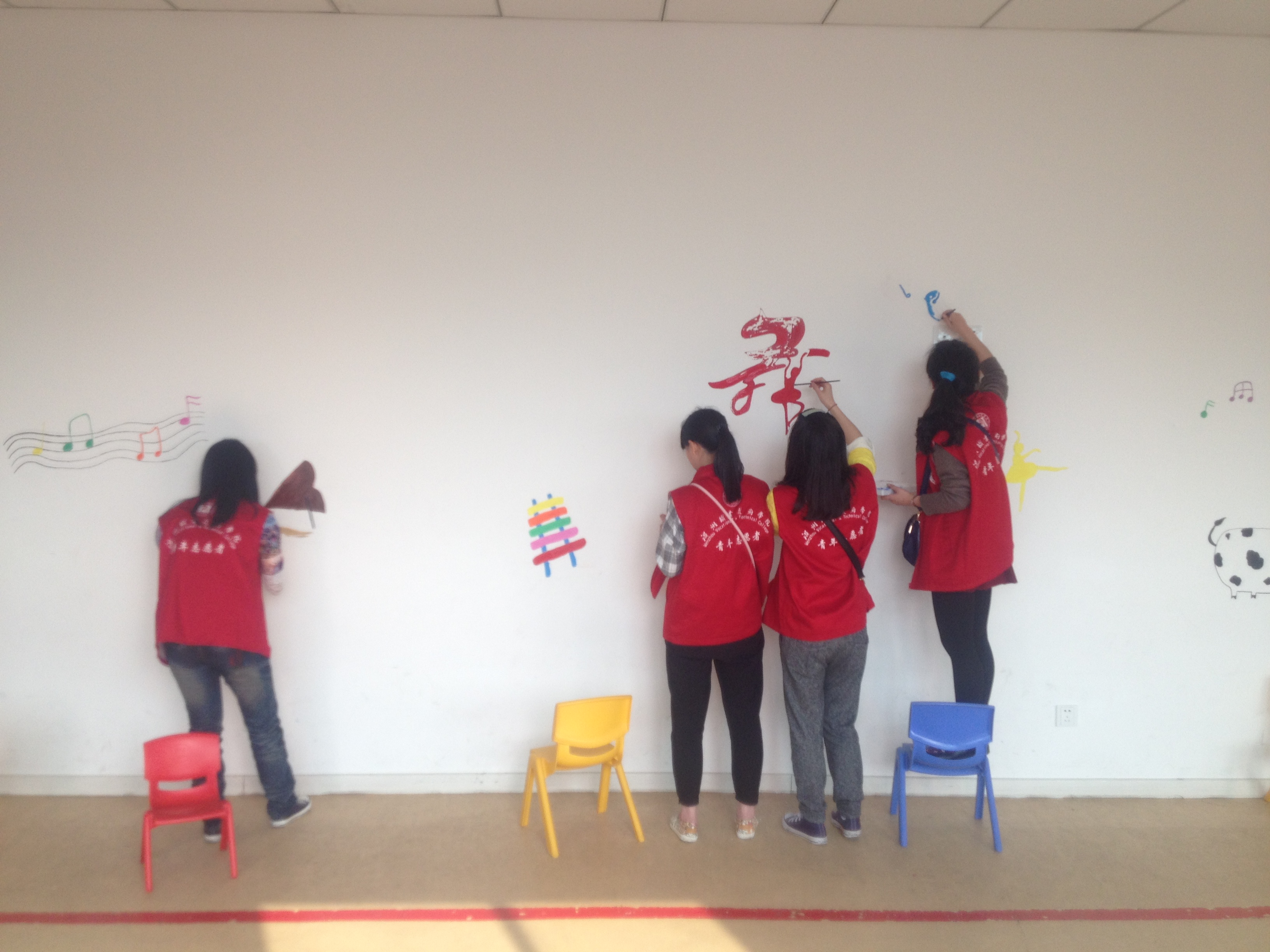 据了解小银河特殊教育培训学校创办于2007年,主要招收自闭症(孤独症)、语言障碍、多动症等各种发育障碍的儿童。与想象中不同,这些孩子们都显得比较活泼,在老师的带领下做着各式各样的游戏,愉悦的氛围也感染了到达现场的志愿者们。随后,他们兵分两路,一组忙着帮学校打扫卫生,一组忙着在墙壁上尽情发挥创意的绘画。
