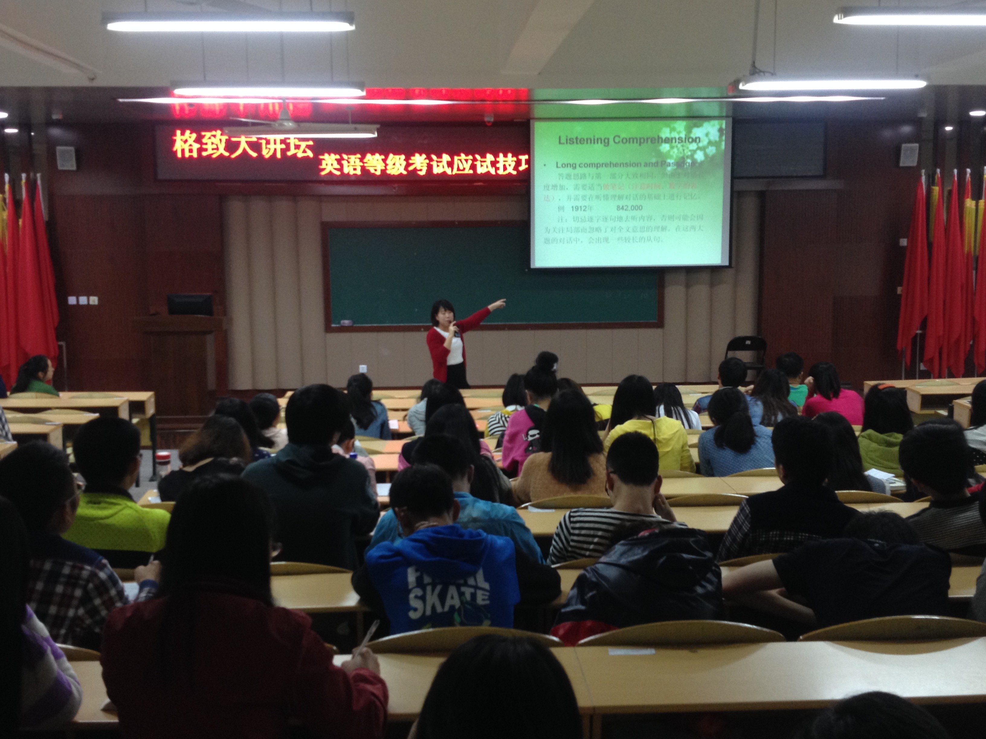 为了让同学们能更好地应对大学英语等级考试, 5月5日晚,信息技术系格致大讲坛之英语考级应试策略专题讲座在好学楼101举办。本次主讲人为我系教学秘书陈喆老师,近百名学生参与此次讲座。