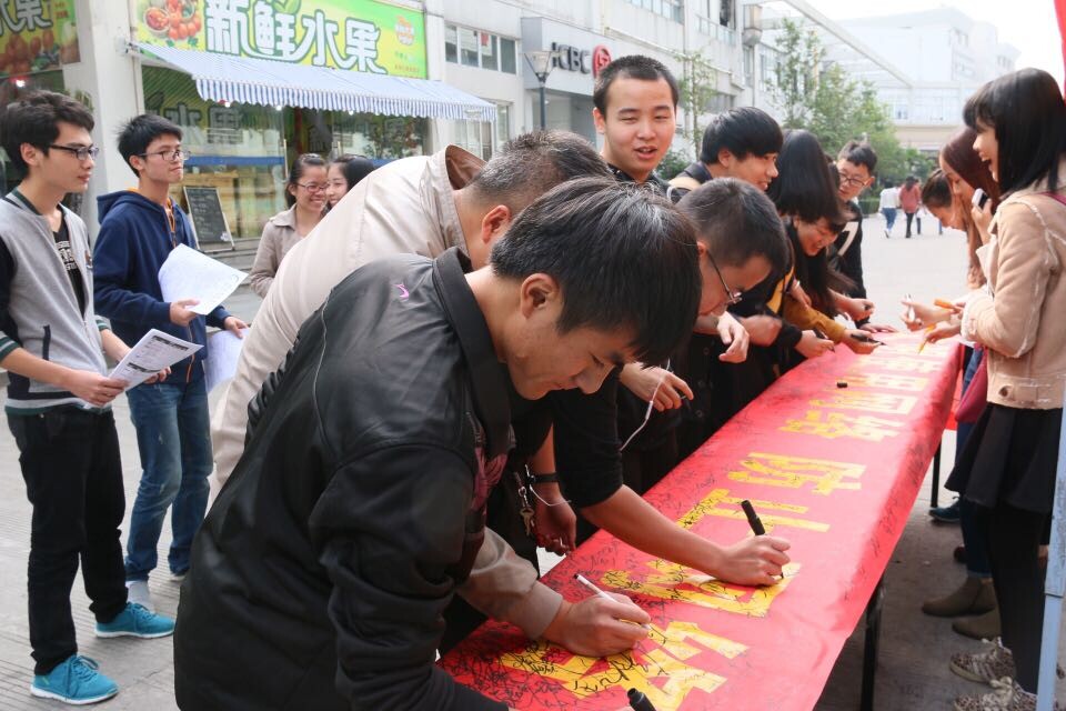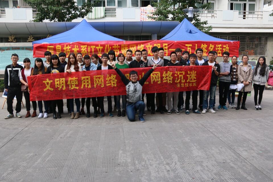 为提倡文明上网,健康上网,引导学生走出寝室,走进校园,决拒绝网络沉迷。11月26日11点30分,信息技术系在第一餐厅举行了第八届IT文化节暨网络文明月之万人签名活动。