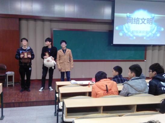 为让同学们充分了解网络世界,正确理解网络用语,树立良好的文明上网新风,12月15日晚18:30,信息技术系在好学楼201教室举行以网络用语为关键词的超级演说家总决赛,担任本次活动评委的有信息系学生会副主席陈俊宇、自律委员会副主席陈苍浩、社工部部长裘鑫豪、机械系团工委书记尤育龙、人文系洪晖鸽、机械系团工委副书记曾卫卯。