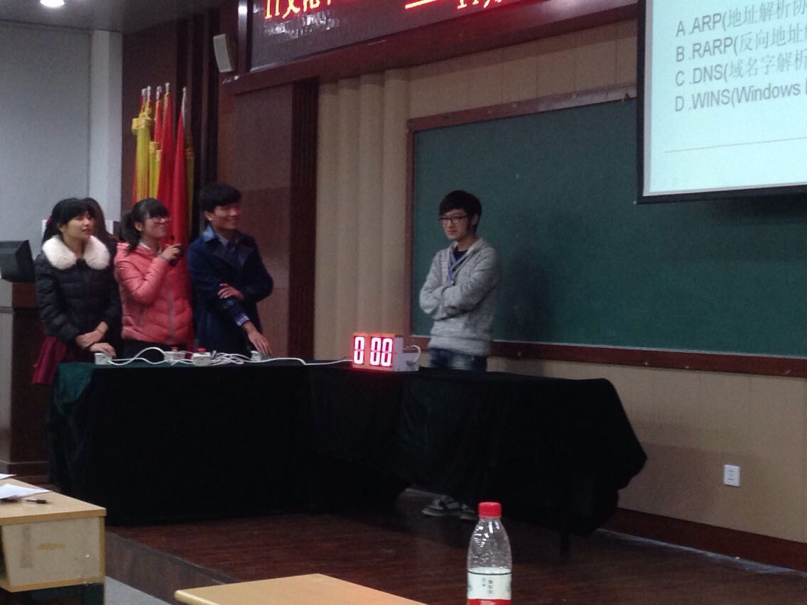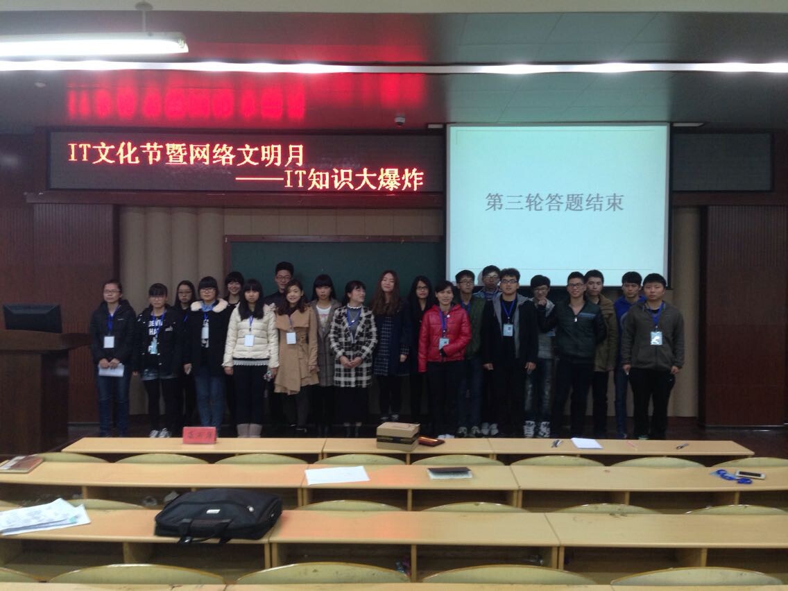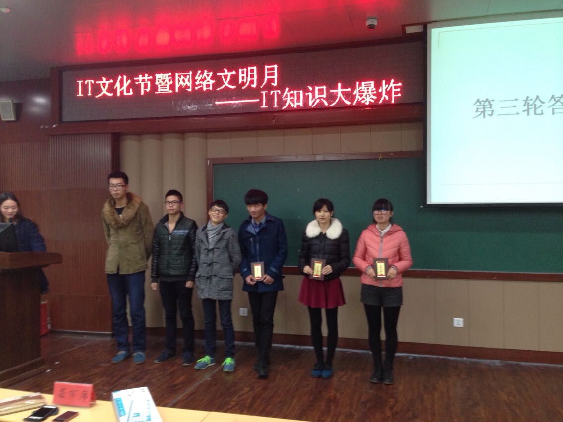 据悉,本次比赛有10为同学参加,比赛共分3轮。第一轮的比赛就十分的激烈,选手们没有丝毫的懈怠,凭着自己平时积累的IT知识展开了精彩的较量,有的选手答对了全部题目,有的选手答错了一两题而被淘汰。随后激烈的比赛进入了第二轮,剩下的5名选手都是有备而来,第一局的问答出乎了大家的预料,5名选手都答对了所有的题目,台下的观众用自己最响亮的掌声来表达敬佩之情。经过评委们的一番讨论后,决定再进行一局比赛,难度比上局有所增加。选手们也没有放弃,抱着一战到底的决心开始答题,由于紧张的原因,两名选手出现了失误,所以最后由剩下的3名选手来竞争比赛最后的赢家。第三轮为抢答赛,两个女生反应敏捷,而男生一次抢答的机会都没有抢到,分数无奈被女生给超了过去。最后是由其中一名女选手获得了胜利,赢得了本次比赛的最终大奖。