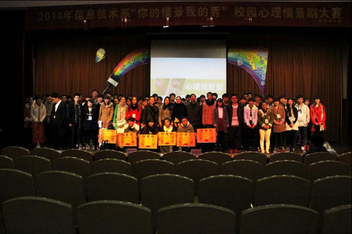 为塑造大学生健康,积极向上的品格,引导同学们积极思考,认真面对, 12月22日晚18:00,信息技术系在树人堂举办了“你的情景 我的show”第三届心理情景剧大赛。信息技术系大一学生和班主任参与了此次活动,系党总支书记童炳金、学工办主任罗小阳、辅导员李文静、系辅导员李小琦担任此次大赛评委老师。