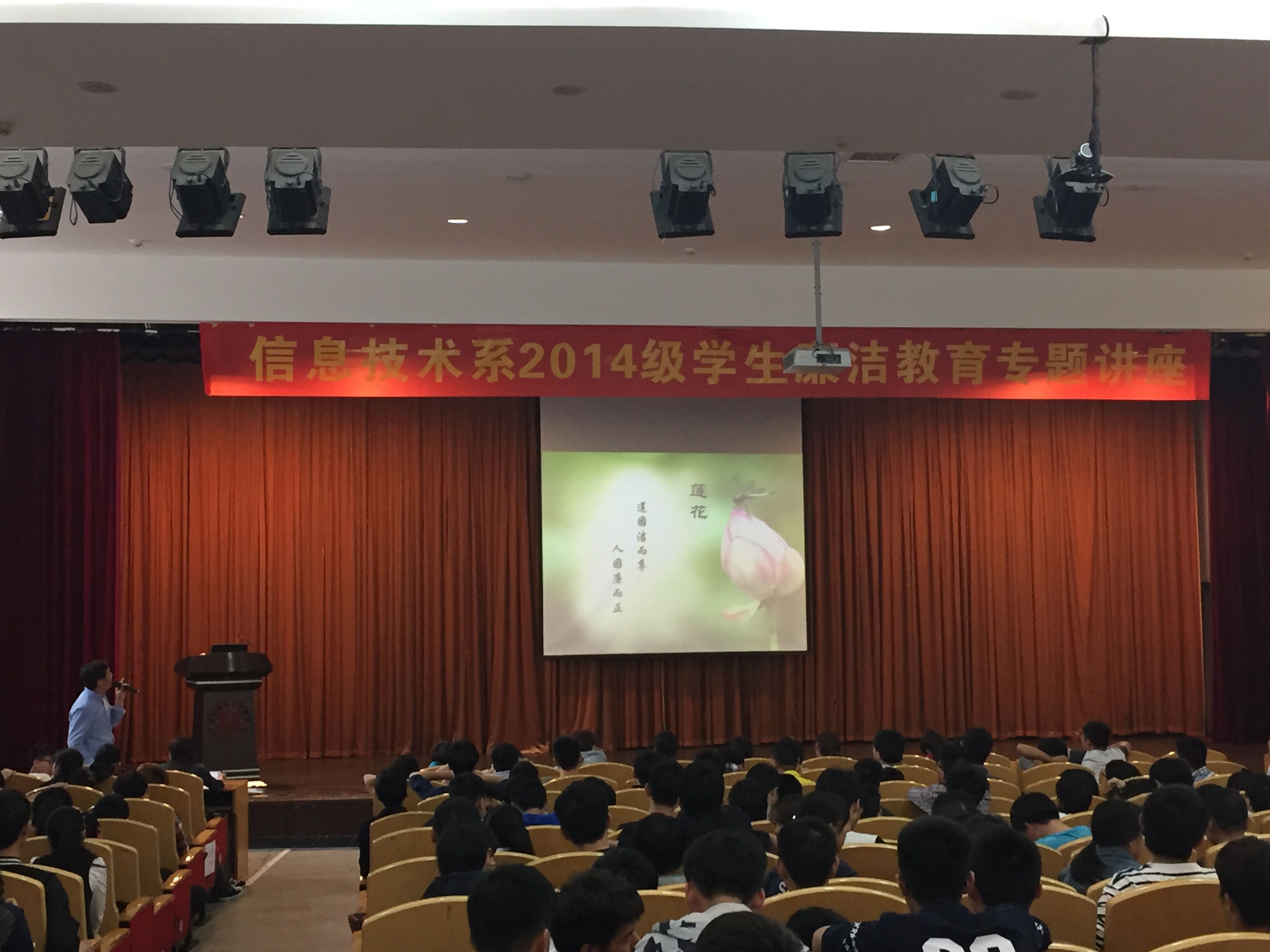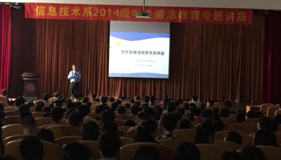 5月6日下午,信息技术系在树人堂召开2014级学生廉洁教育专题讲座,此次讲座由系党总支书记童炳金老师主讲,全体14级学生听取了此次讲座。