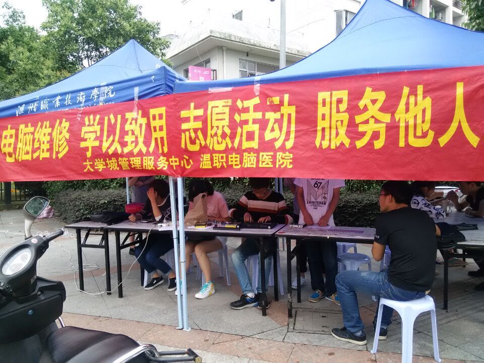 学以致用,服务他人,5月23日-24日,温职院电脑医院联合大学城管理服务中心在温医生活区开展免费电脑维修活动,共有20名志愿者参与了此次活动。