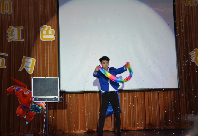 比赛以一段激昂的朗诵《翻开五月》开场,火红的五月,奋斗的青春,五月我系举办了心理知识竞赛、简历设计大赛、摄影比赛、党史知识(廉政专题)竞赛、辩论赛等活动,昨日的付出,今天的收获。红五月系列活动颁奖典礼后,班歌大赛正式拉开序幕。同学们热情高涨,11个班级,11首班歌,11个视频短片,代表了11种班级文化,各班的创意层出不穷,从班服、队形、演唱方式下足了功夫。网络1402班首当其中,一首《梦想天空分外蓝》点燃了现场氛围,赢得了阵阵喝彩;多媒体1401班也毫不逊色,用手语和挥动的绿手带演绎了一首《爱,因为在心中》,青春飞扬,活跃了现场氛围,更有班主任徐婧老师倾情献唱;信息1402班红与黑的班服,采用鼓和红旗元素带来一首《精忠报国》,顿时让现场同学们眼前一亮;还有电子商务1402班的《中国人》、软件1402班的《仰望星空》,同学们的表演都极具感染力,更是赢得了台下阵阵掌声……最后一首歌曲来自信息1401班的《真心英雄》,在翁正秋老师的指挥下,整个班级是一个“伐木累”。比赛期间,穿插了互动游戏、小品《江湖》以及精彩的魔术表演,更有学生处白洪兴老师的助力演唱,一首《北京,北京》为此次活动画下了圆满的句号。