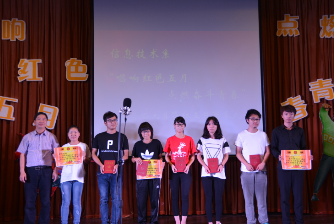 6月8日晚,信息技术系在树人堂举办“唱响红色五月,点燃奋斗青春”班歌齐唱大赛暨红五月闭幕式。本次比赛由系主任田启明、系书记童炳金、系学工办主任罗小阳、机械系学工办主任梅碎彬、学生处白洪兴5位老师担任评委,全体14级学生和班主任参与了此次活动。