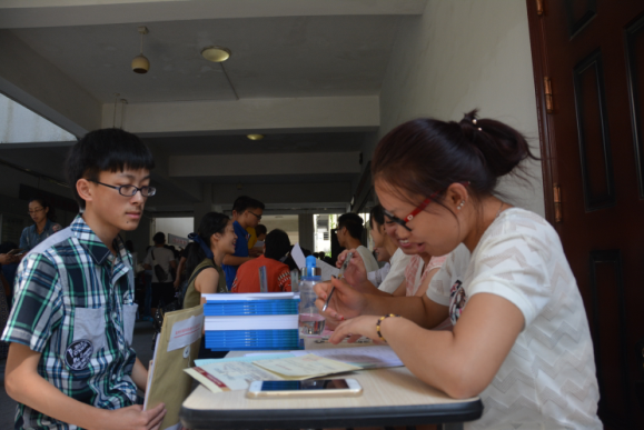 上午7时30分,学校新学年迎新工作正式拉开序幕,此时我系好学楼一楼,来自全国各地的2015级新生在家人的陪伴下陆续地来校报到。新同学个个脸上都挂满了激动的笑容,心中难抑兴奋之感,其中不乏有一些学生好奇地向志愿者们询问生活、学习、报名程序等相关问题,而志愿者们的耐心回答与热心指导也让新生和家长们心里倍感温暖。