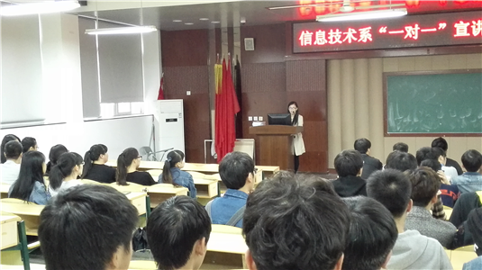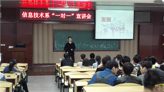 11月4日下午,我系在好学楼101举办2016届毕业生“一对一”宣讲会暨网络专业学生实习双选会。当天,浙江豪联科技有限公司、浙江索思科技有限公司、浙江怡联科技有限公司、温州市众成企业有限公司、浙江帝杰曼信息科技股份有限公司等5家公司主要负责人和网络全体师生参加了此次宣讲会。
