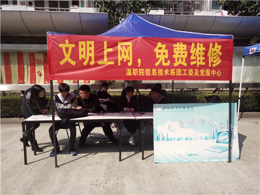 为发挥学生专业优势,服务全院广大师生,3月2日中午,信息技术系党员服务中心在温职生活区开展免费电脑维修活动。