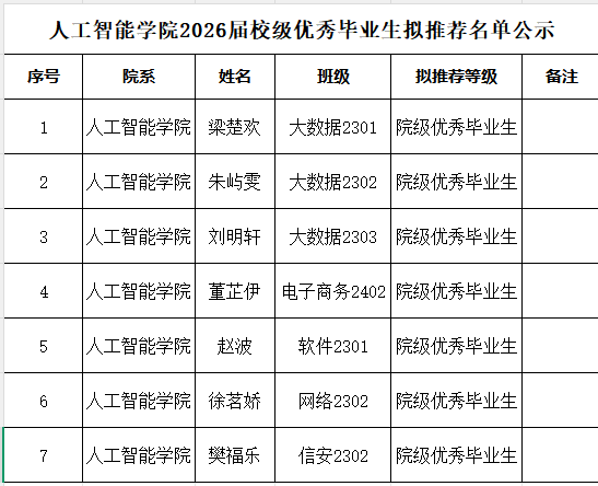人工智能学院2026届院级优秀毕业生拟推荐名单公示